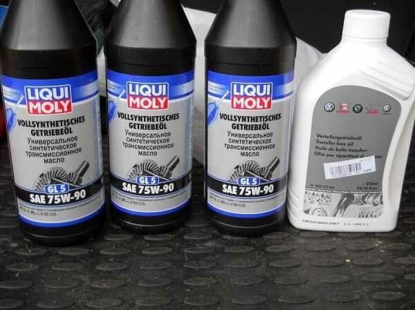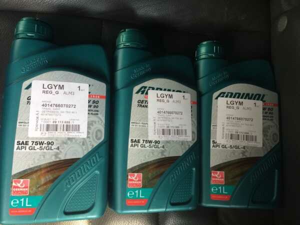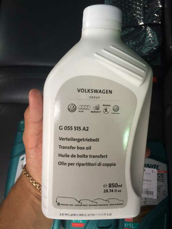 Добрый день, товарищи. Данных записей на сайте drive2.ru вполне хватает, но и моя лишней тут не будет. Сегодня производил замену масел в двух редукторах (перед, зад), и раздаточной коробке. Масло в редуктора хотел залить Castrol 75W-90 Syntrax, но такового не оказалось на московских складах, ибо ждать было ещё + неделя, нашёл достойный аналог- Addinol 75W-90 API GL-5/GL-4. Приобрёл 3 литра, так как в задний задний редуктор входит более 1,2 литра, на передний редуктор 1,0 литра. В раздатку залил оригинальное масло — VOLKSWAGEN GROUP G 055 515 A2. Заказал один бутыль (800 ml). Столько же и входит в раздатку, на донышке остаеться совсем немного.Масло которое слилось с редукторов и раздатки было отнуть не светлое и с неприятным запахом. Сливные и заливные пробки заказывать не стал, мои в хорошем состоянии и сюда по виду масла, моя замена была первой. Данные процедуры рекомендую производить на подъемнике.